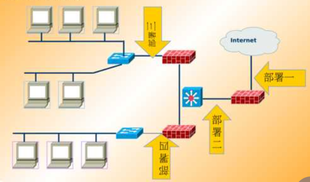 - Internet接入路由器之后的第一台交换机,如下图中的部署一的位置和部署二的位置。用于统计丶监视进出整个内网区域的流量,对内网区域进行保护;部署一和部署二的区别在于是否对对防火墙的入侵行为进行监控。